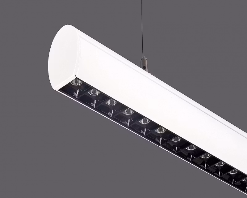 Nedpendlad linjär armatur med svart reflektor och avbländning. Styrning finns som tillval (DALI, 1-10V)